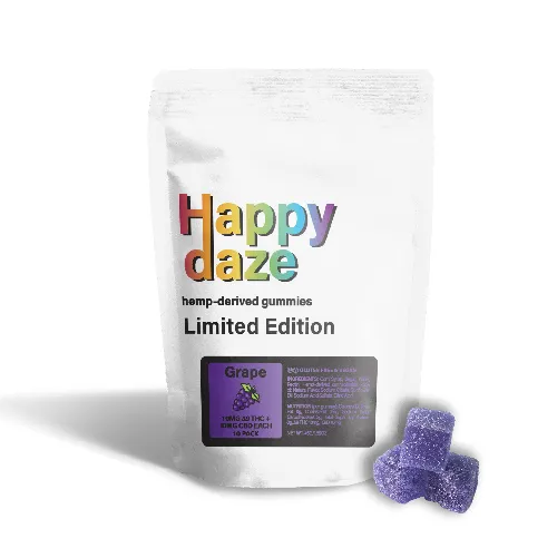 Happy Daze meets CBD for this 1:1 ratio gummy. These grape gummies are made from premium hemp-derived Delta-9 THC distillate, and always third-party lab tested. These consistently-dosed gummies are similar in potency to edibles sold at dispensaries – 10mg THC and 10mg CBD per grape gummy – 10 gummies per pack.