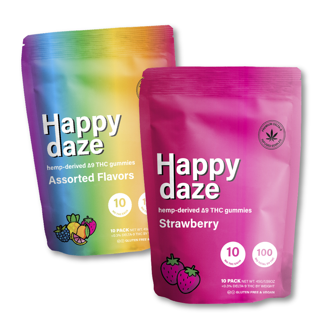 Happy Daze Strawberry & Rainbow Assorted Vegan and Gluten-Free Delta-9 gummies are made from premium hemp-derived Delta-9 THC distillate, and always third-party lab tested. These consistently-dosed gummies are similar in potency to edibles sold at dispensaries – each gummy is 10mg D9 THC.