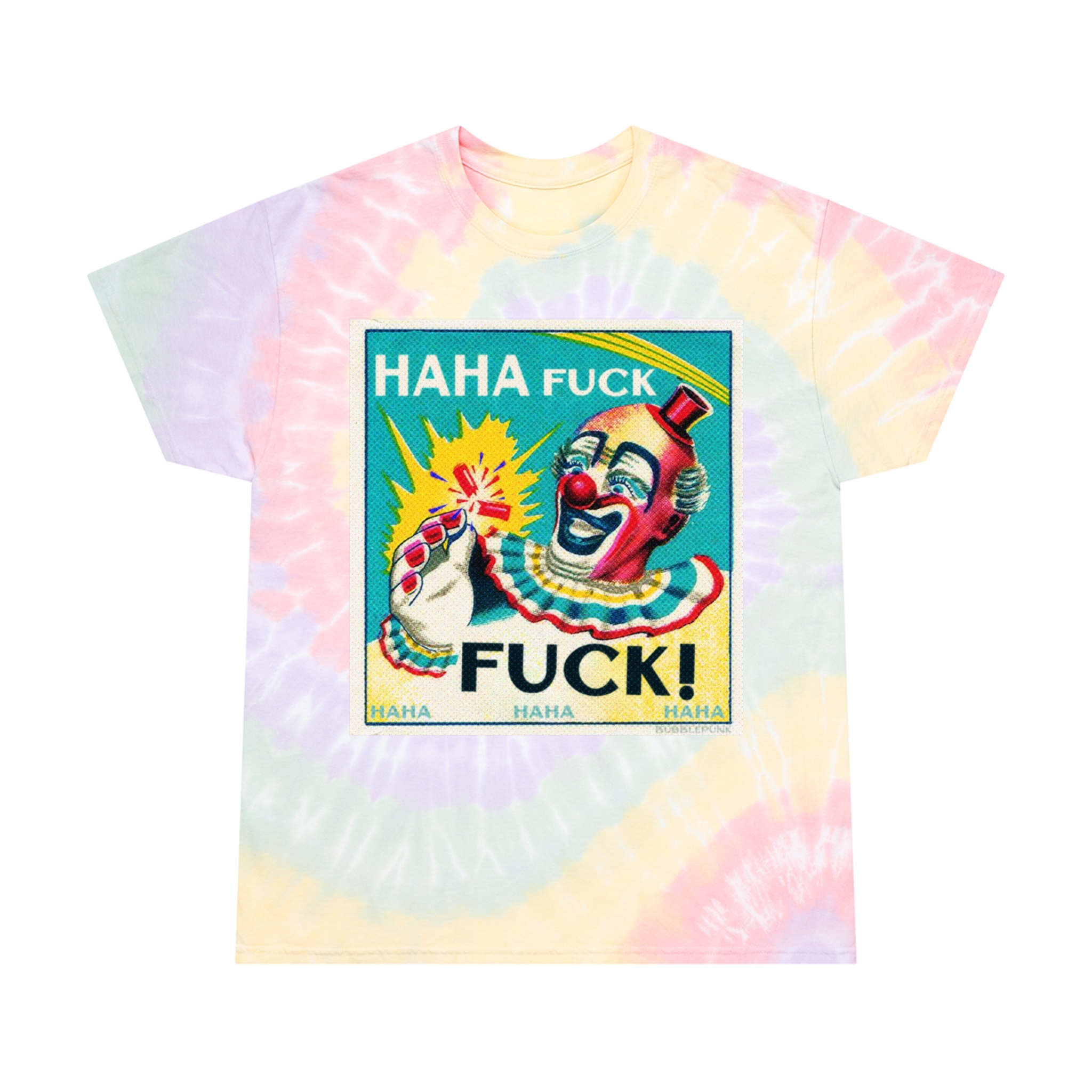 This Bubbles The Clown Tie-Dye Tee, Spiral is available in these colors: Hazy Rainbow and these sizes: S, M, L, XL, 2XL