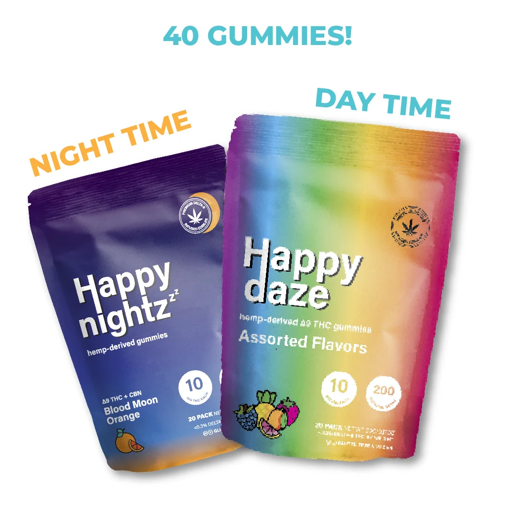 Happy Nightz Gummies are perfect for bedtime – each gummy contains 10mg of hemp-derived delta-9 THC distillate and 10mg of CBN isolate. Experienced users should take 1 Happy Nightz gummy (10mg D9 THC & 10mg CBN) an hour to 30 min before sleep. First timers or folks with low tolerance should start with half of one gummy.
