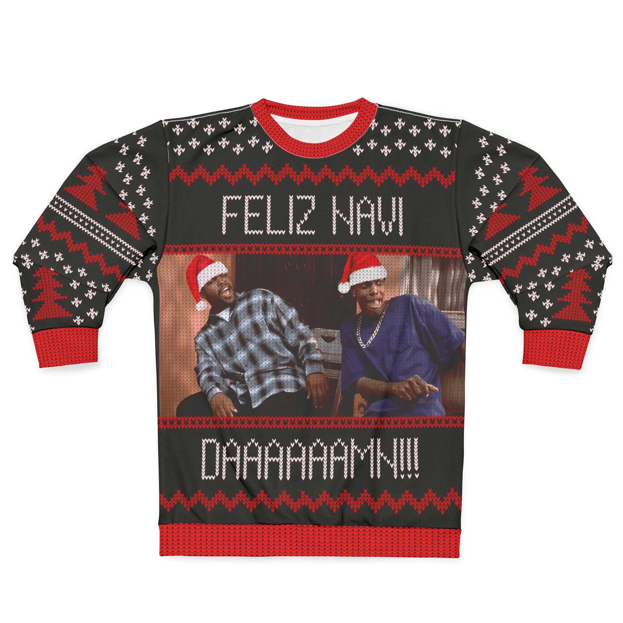 This Feliz Navi-DAAAAAAAMN!! Ugly Christmas Sweater is available in these : and these sizes: XS, S, M, L, XL, 2XL