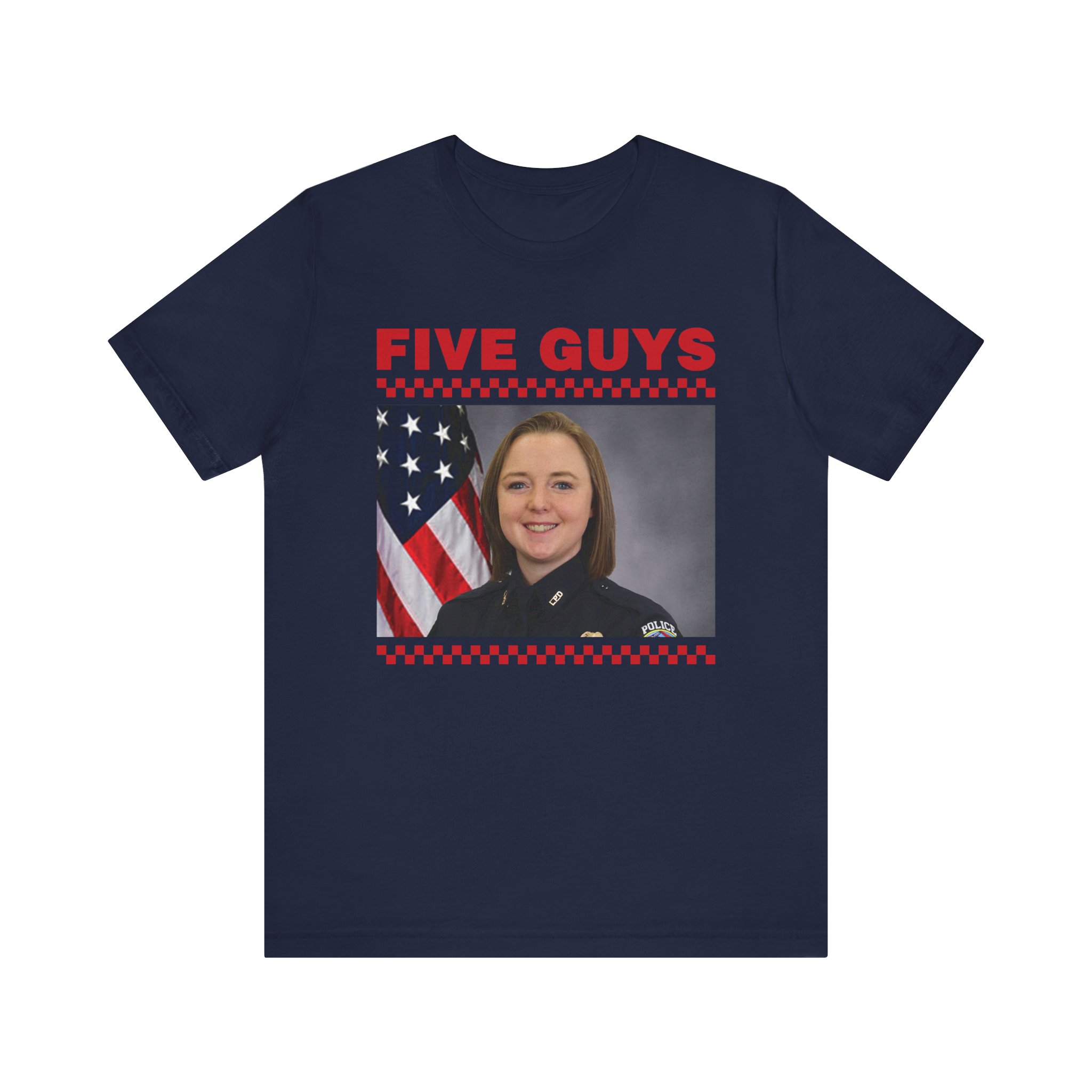 This Five Guys Tee is available in these colors: White, Black, Navy and these sizes: XS, S, M, L, XL, 2XL