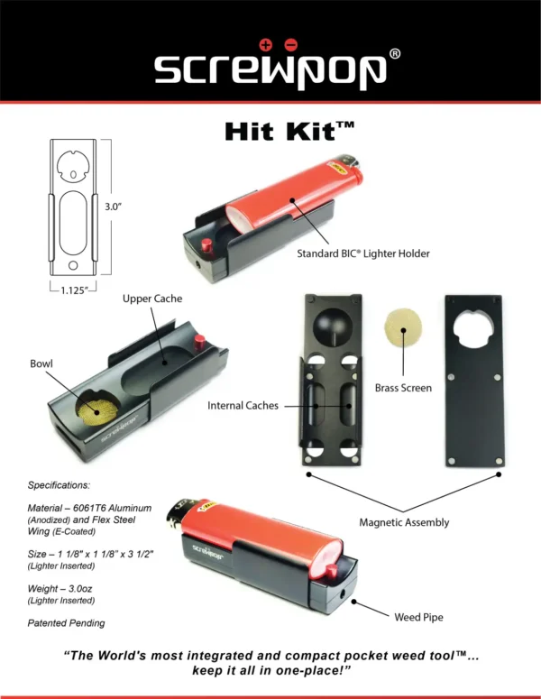 This Hit Kit is a pipe, stash, and lighter holder. Pre-load your bowl and some extra weed, then slide an ordinary BIC-sized lighter in to hold your bud in your pocket when you hit the road. A few servings of smoke on the road. Perfect for a concert or festival, hiking trip or visit to a local garden.