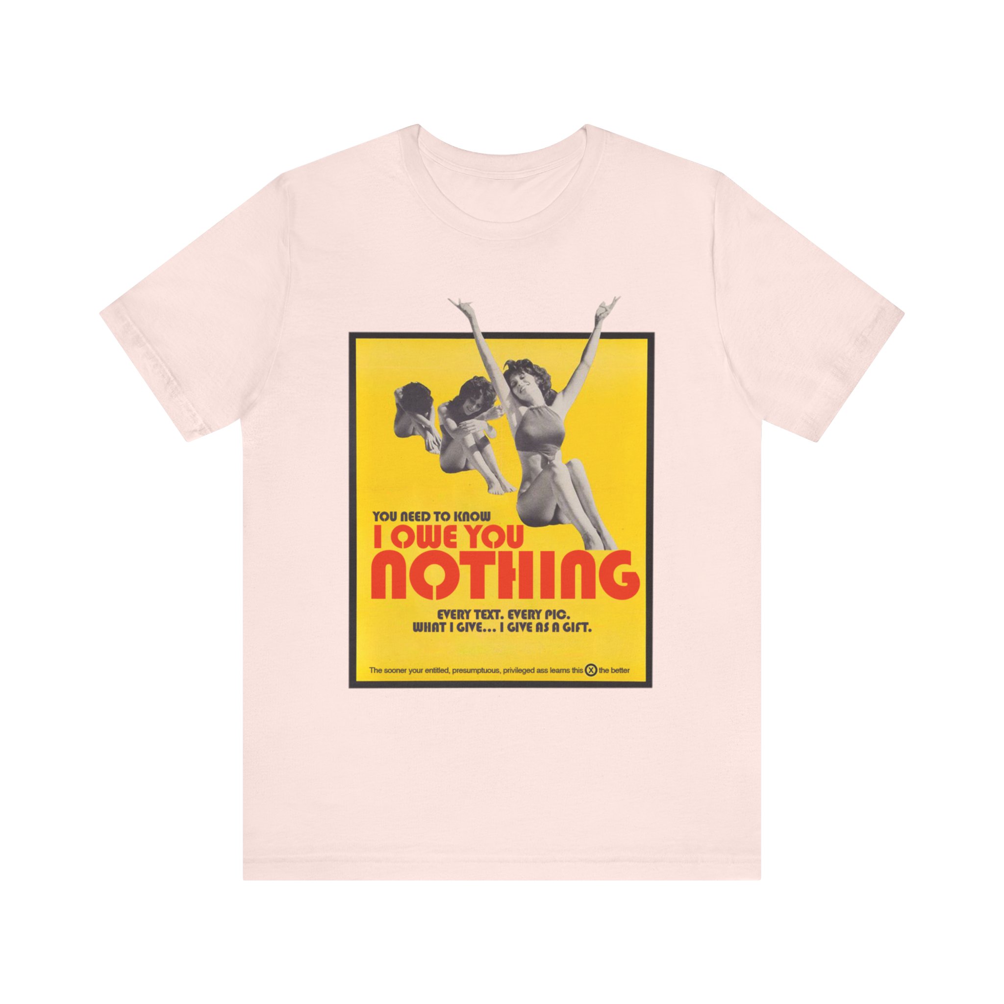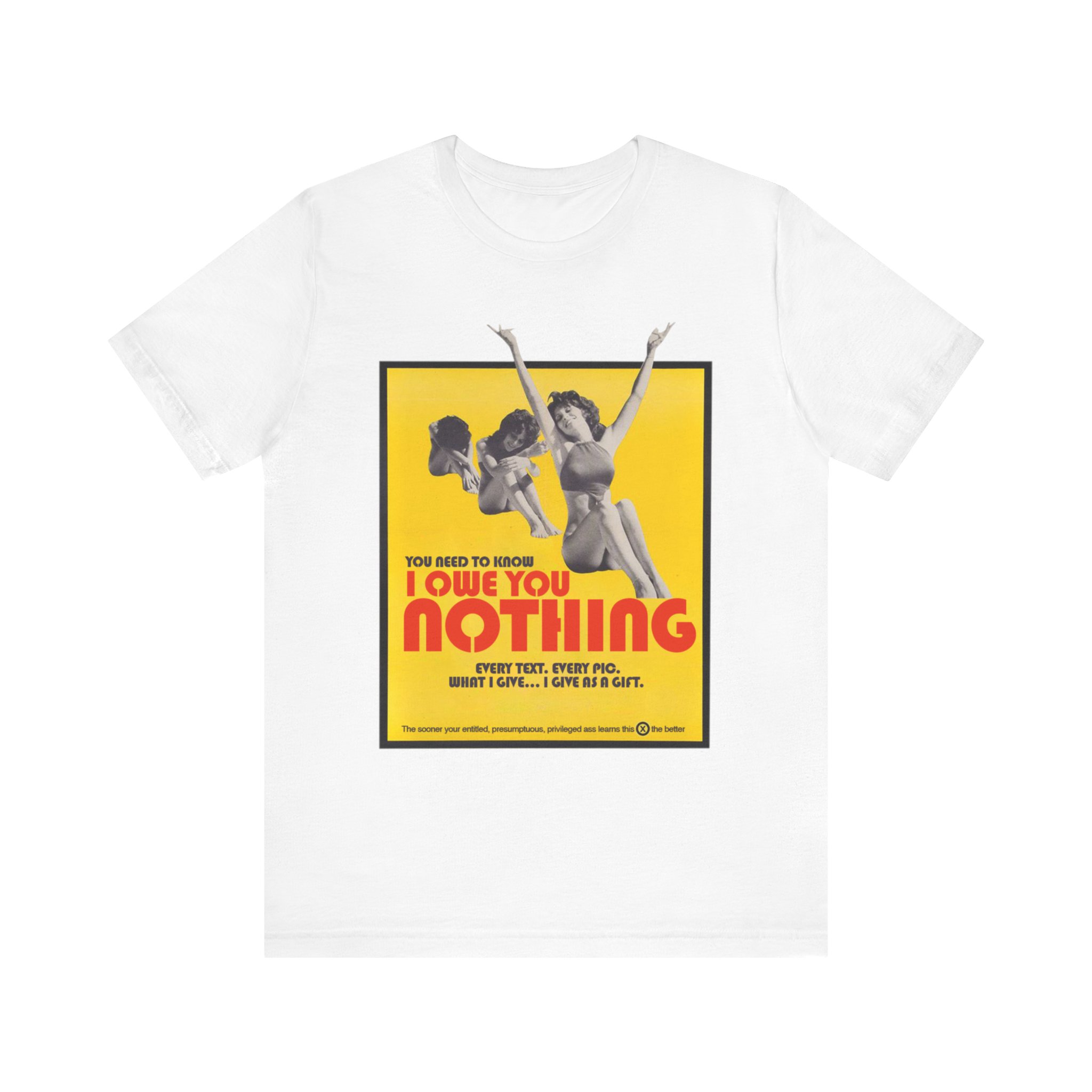This Owe You Nothing Tee is available in these colors: White, Soft Pink, Black and these sizes: XS, S, M, L, XL, 2XL